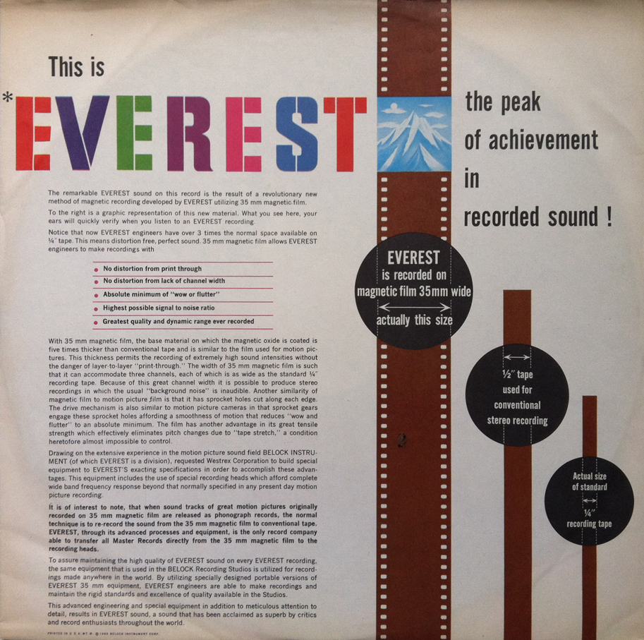 EverestThis is 1959, and size matters. Until the launch of “the remarkable Everest sound”, we’ve all been, collectively and obliviously, shortchanged when it comes to the quality of our audio recordings. You see, standard tape size for recording audio (that will later be transferred, then pressed into a platter spinning, groove disc) is ¼” or 6.35mm. Conventional stereo recording is ½” or 12.7mm (feel free to view the picture for tape scale). But Everest, with its 1) No distortion from print through, 2) No distortion from lack of channel width, 3) Absolute minimum of “wow or flutter”, 4) Highest possible signal to noise ratio, and 5) Greatest quality and dynamic range ever recorded, well tape stock used by Everest clocks in at a whopping 35mm! How you feeling now, standard and conventional stereo recording? Not so good, huh? Once you go thick, you’ll never get sick. Once you drop thin, you can’t help but grin. Or how about, once you go fat, you’ll never look back… I give up.
