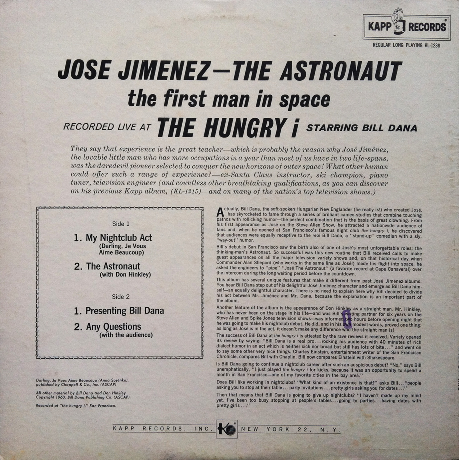 José Jiménez was a fictional character played by the comedian Bill Dana, who is neither Hispanic, nor an astronaut. First appearing on The Steve Allen Show back in 1959, José Jiménez, or rather Bill Dana portraying this character he’d invented, gained considerable popularity throughout the 60s, appearing on television (The Steve Allen Show and The Ed Sullivan Show) as well as releasing seven LPs and two singles.