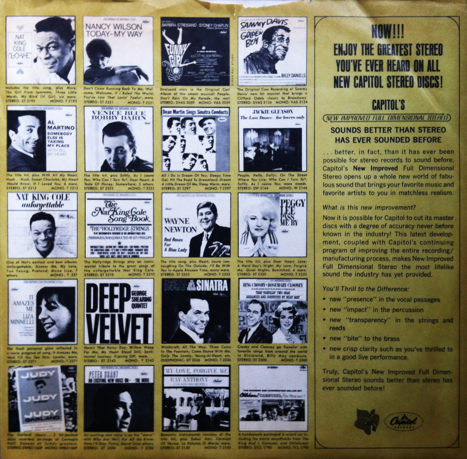 New Improved Full Dimensional Stereo is revolutionary it its approach to releases offered by Capitol Records. By offering new “presence” in the vocal passages, new “impact” in the percussion, new “transparency” in the strings and reeds, and new “bite” to the brass, you’ll swear Liza Minnelli is actually belting out “her fresh personal glow” right before your watering eyes.