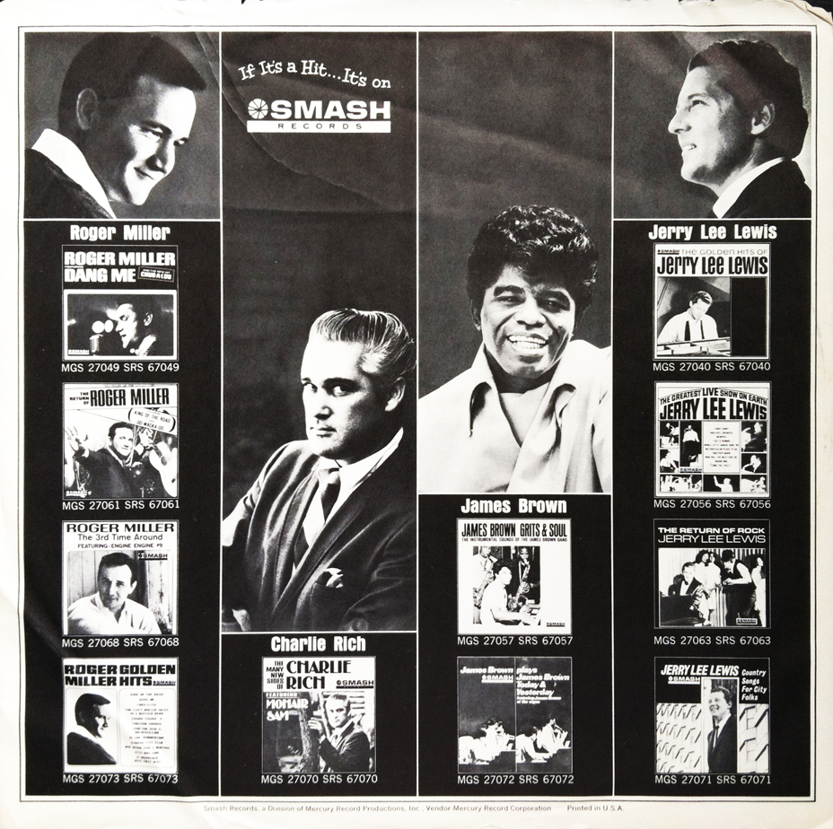 Roger Miller, Charlie Rich, James Brown, and Jerry Lee Lewis were all fantastic artists… but if your entire music vocabulary consists of only Smash Records recordings, 1) you’ve got a lot of work to do and 2) your lack of music-listening happiness gathers no sympathy from me.
