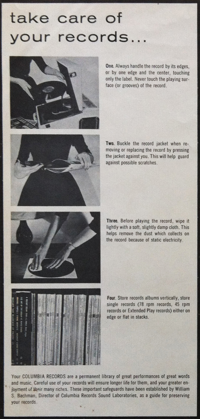 Take Care of Your RecordsBack by unpopular demand, and just in case you suffered a swift blow to the head, presented here, with all its painstakingly careful glory, is yet another “How to Take Care of Your Records if You’ve Never Owned Anything That You’d Like to Keep for More Than a Day.” This round… Columbia Records.