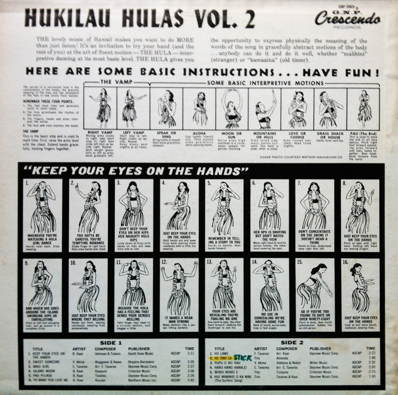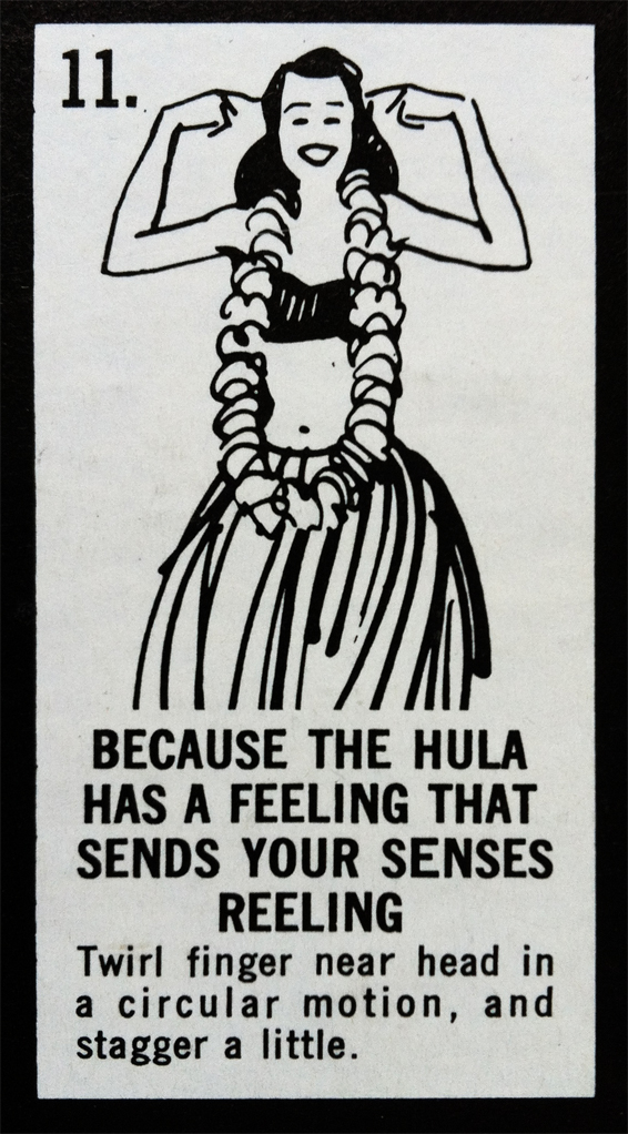 Hulas vol2Thrift store hunting in The Valley yields some hip-swaying, luau-attending, hand-watching results. Who knew, am I right?! Recently acquired was this copy of Hukilau Hulas Vol. 2 (featured here, the back cover). “Keep your eyes on the hands” is more than a hula skirt-wearing, seductive suggestion for those looking for a quick lei (sigh), but instead, a graphic designer’s dream job featuring 16 (slightly) varied action-based hula illustrations.