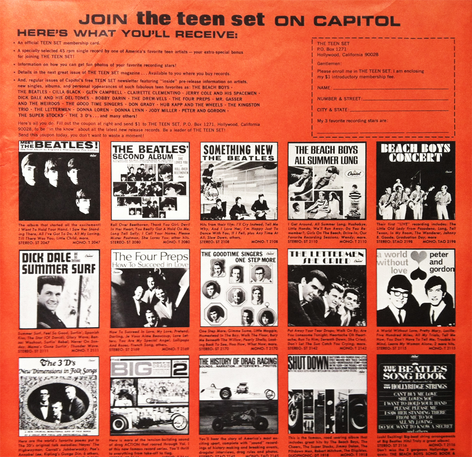 For just $1 (circa 196?) you can inform the “gentlemen” (sorry ladies of yesteryear, your day had apparently not yet come) that you’d generously prefer an introductory membership to the prestigious Teen Set, exclusively offered by Capitol Records. Yes, The Beatles are present and accounted for, and yes, The Lettermen are lingering there too, but the real steal is the “official Teen Set membership card.” Justified bragging rights for any and all who join, the Teen Set on Capitol seems like the logical, and most important post-pubescent decision any of us has ever been forced to make. Tickle your fancy with The Four Preps, The Goodtime Singers, or even The History of Drag Racing, and maybe, just maybe, your remaining teenage years will be void of awkward embarrassment… though, chances are, that inevitable boat of fictitious folly has already set sail.
