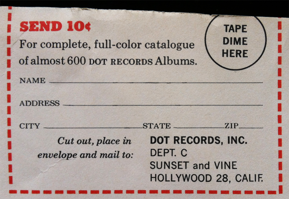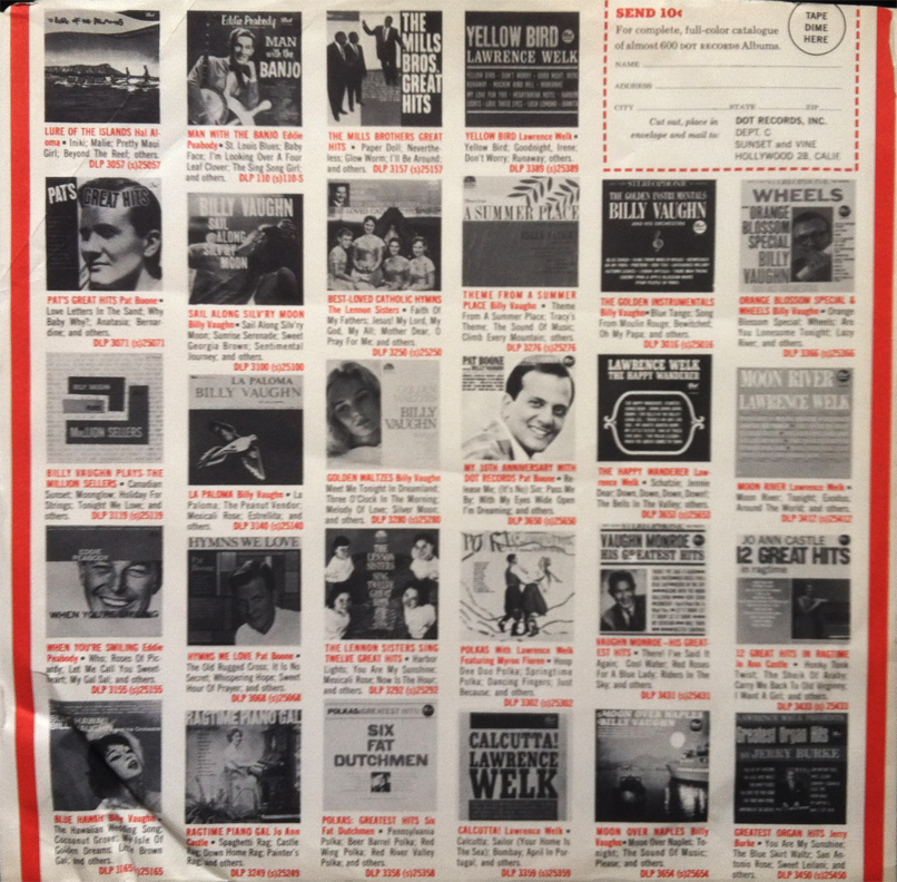 From the Six Fat Dutchmen, to Billy Vaughn, to the Lennon Sisters, to Pat Boone singing Hymns We Love, Dot Records is home to almost 600 albums, whose complete, full-color catalogue can be had for a measly double nickel. Unlock the door to the (piercing) enchanted sounds of Eddie Peabody on Man With the Banjo, or roll along with the Spaghetti Rag playin’ Jo Ann Castle on Ragtime Piano Gal, or better yet, exercise your inner desire for mid-50s variety shows with Calcutta! by Lawrence Welk. Yes, all the albums you could ever hope to want are here on Dot Records, so don’t delay! Cut and fill out the attached coupon, flip that puppy into an envelope and mail it to: