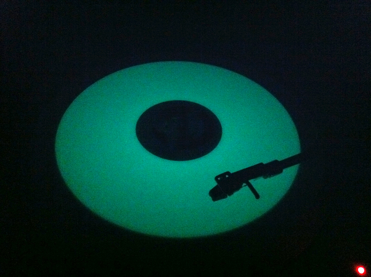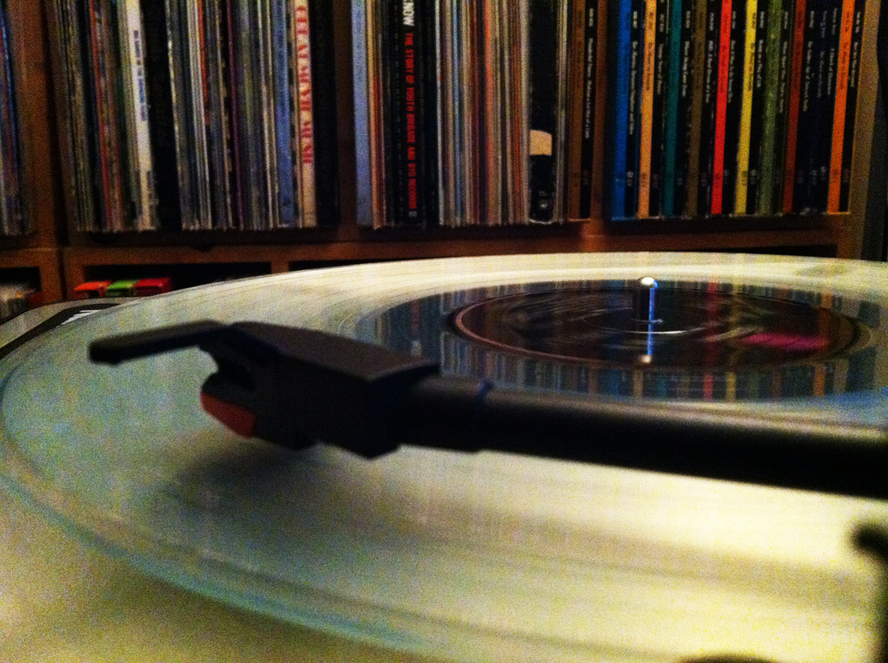 I don’t have much to offer tonight except for this half-assedly composed (that’s the industry term) action photo of my all-time favorite flavor-shade (read: color) of polyvinyl chloride. One would think that the absence of normality (in this case, white), would tickly my ear’s fancy, but I rather find myself a gullible sucker for the opacity of clear records. My exhaustion has taken its toll, and the Groove is taking the blow.