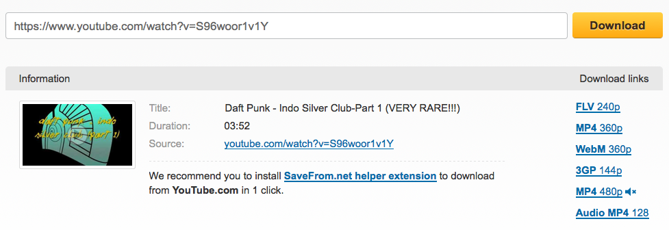 Say you’re at work on a Sunday, and while eating lunch at your desk, you start to rummage around Wikipedia for info on Daft Punk singles. Now say, you head on over to Discogs and a particular singe, let’s say Indo Silver Club (Part One) catches your eye (mainly because you’ve never heard of it, and the words “Daft” and “Punk” don’t appear anywhere on the record, credits, sleeve or otherwise). Discogs offers a handy little videos section which plays fan-uploaded YouTube clips. More time than not, you can find a video for every song, including some of the more rare releases. What I’m jivin’ at is this… without any additional software, purchased, borrowed, etc., you can turn these free videos into mp3 files, and bump them to the portable digital listening device of your choosing.