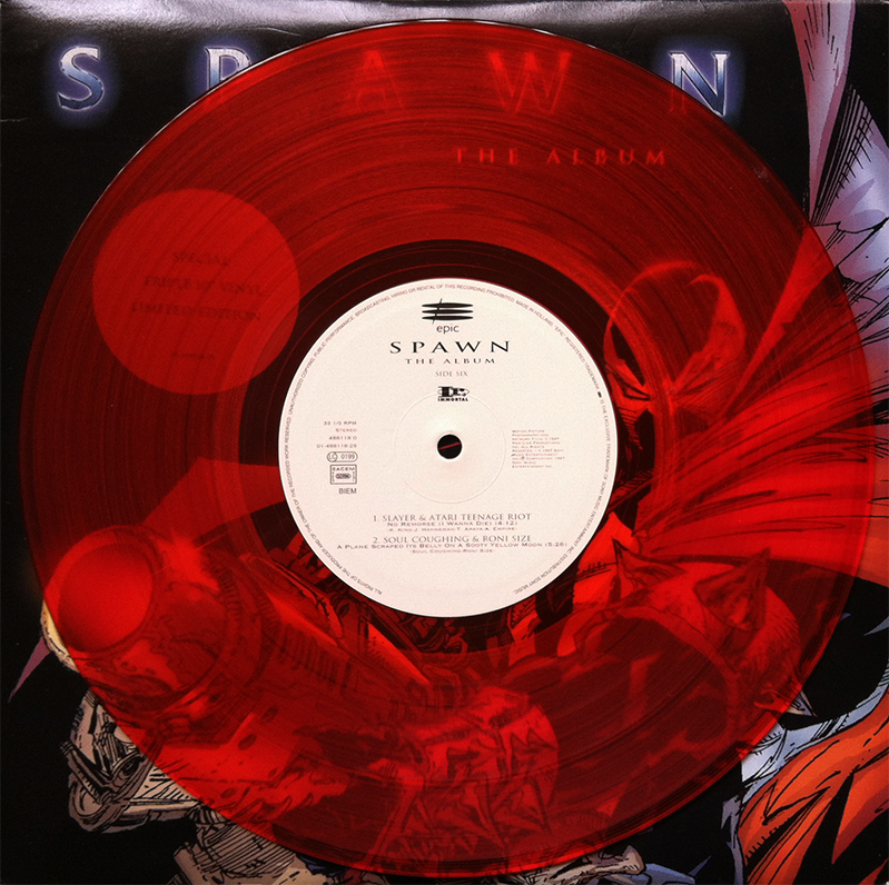Spawn_creditsIt’s this last one that sets the adrenaline dial way past 11. A UK release of only (lol, “only”) 5,000 copies on triple translucent red 10″, Spawn the Album was released in 1997 in support of the New Line Cinema film, Spawn or, Spawn the Movie.