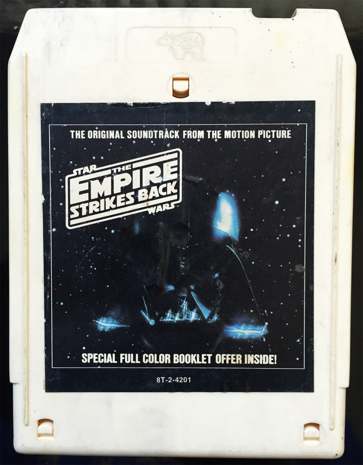 I set out to acquire the Jaws soundtrack on 8-Track for the upcoming annual Jaws Day (July 3rd, don’t forget), and I ended up with a dirt cheap, fully functioning set of the following, all on glorious 8-Track: Jaws (Music from the Original Motion Picture Soundtrack), Star Wars (The Original Soundtrack from the 20th Century-Fox Film), and this copy of Star Wars – The Empire Strikes Back. All in (just about) perfect working condition. I never thought I’d enjoy the romantic static and bass-heavy warmth of 8-Track sound as much as I do… makes me glad I keep the player in the living room. My SO on the other hand…