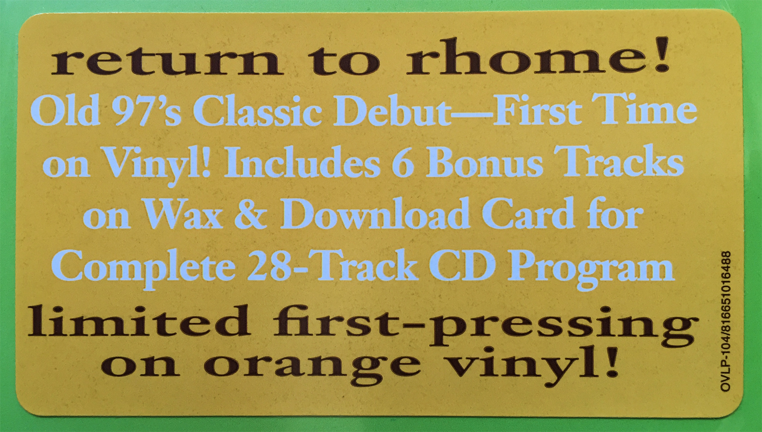 This could have been pressed on oil black, single vinyl with no bonus tracks or download card and I still would have thrown fists full of my hard earned cash for an opportunity to own Old 97’s insanely classic debut, Hitchhike to Rhome. Lucky for me, this puppy is the Cadillac of vinyl releases, as clearly stated by this marketing sticker, and needless to say, I’m giddy over FINALLY owning this uncompromising release.