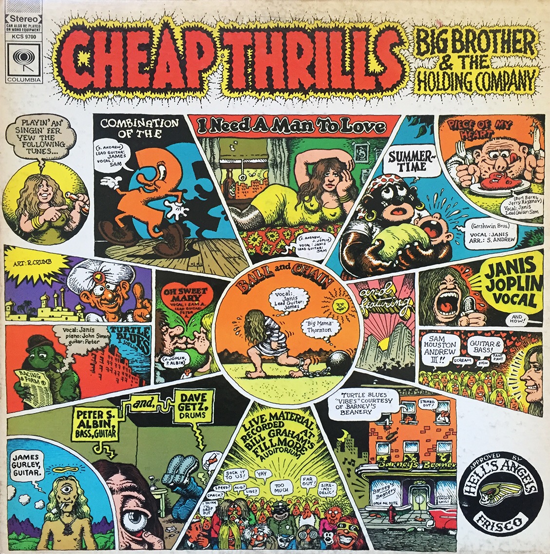 Big Brother & the Holding Company’s 2nd studio album, 1968’s Cheap Thrills, featured not only the groundbreaking single, Piece of My Heart, but also a vibrantly illustrated cover by Robert Crumb. Rolling Stone created a list of the 100 greatest album covers of all time. Cheap Thrills ranks no. 9. Interesting fact is that this was originally intended to be the album’s BACK cover, but apparently Ms. Joplin preferred Crumb’s art to a picture of herself and Columbia Records swapped covers. Smart move if you ask me, and you didn’t.