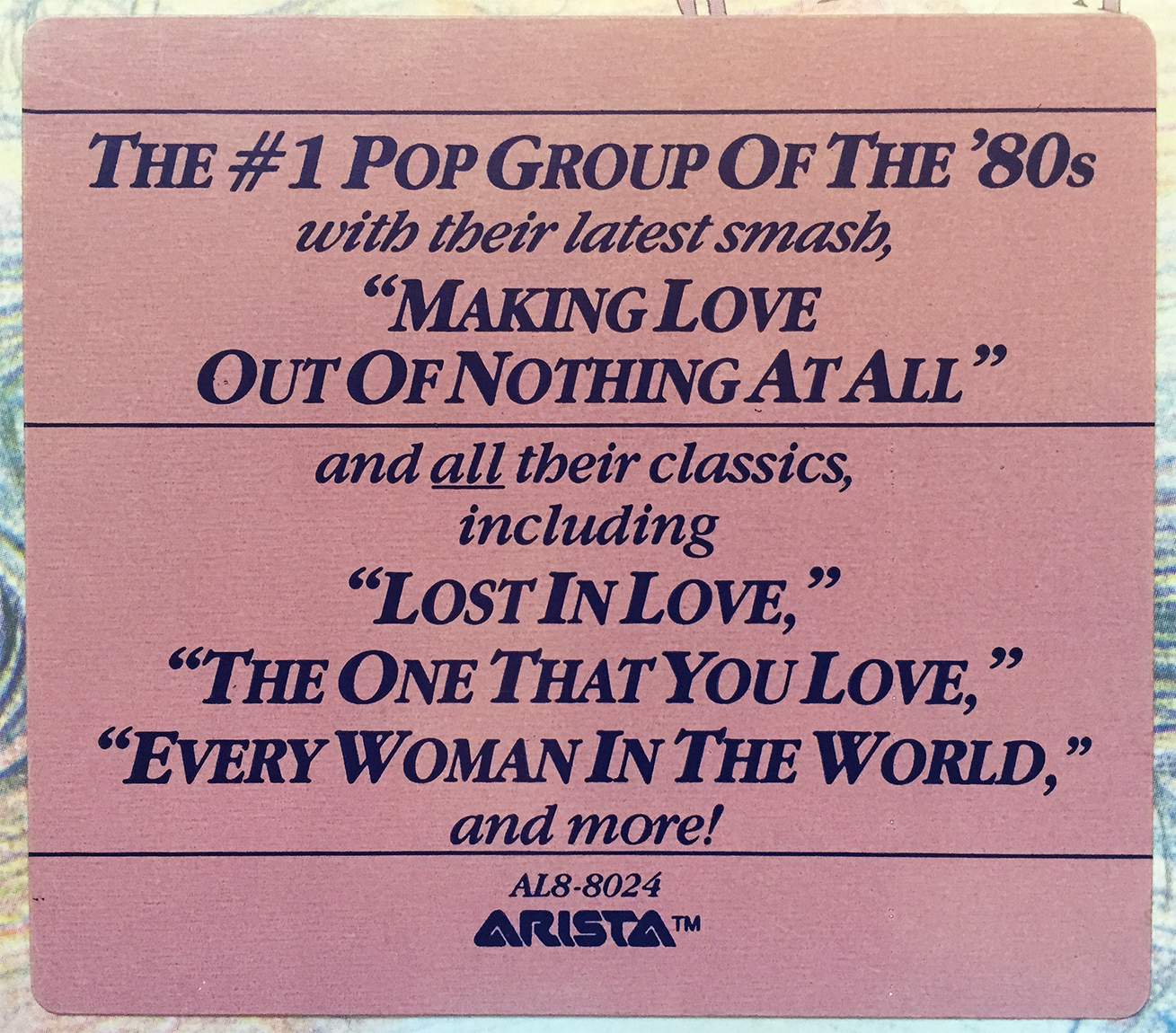 SupplyI’ve never considered Air Supply to be the #1 pop group of the ’80s, and I doubt I ever will. I mean, Making Love out of Nothing at All sounds a little politically incorrect if you take it literally, but it is a damn good song. A smash? Meh. Also, why is the “all” in “all their classics” underlined? I’m surprised the copywriting team only used one punctuation mark to help sell the fruits of these 1980s Gods. At the end of the day, this 32 year old sticker offers a glimpse of Arista Records’ “gotcha” selling points, and deserves to be remembered (to be quickly forgotten again by tomorrow’s post).