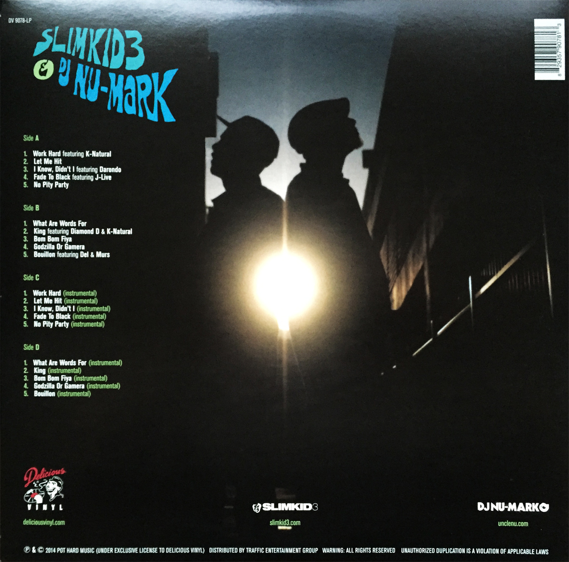 This, is how a record should be released. Main album = disc 1. Instrumental version = disc 2. Done and done. Thank you, Delicious Vinyl, Slimkid3 & Nu-Marc, for not only outputting an exceptionally solid listen, but also for, without question, including the beats as their own, adventurous entity. Well, well worth the price of admission, Slimkid3 & Nu-Marc is as essential as modern day hip hop gets, in our humble opinion.