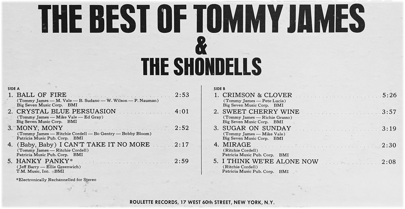 It’s Friday, and it’s getting late. So what better time for some damn fantastic Tommy James & The Shondells? On the list of artists whose discography need completing, I’ll temporarially settle for this Best of comp. Crystal Blue Persuasion and Crimson & Clover… mainly Crimson & Clover. Have a good night, kids.