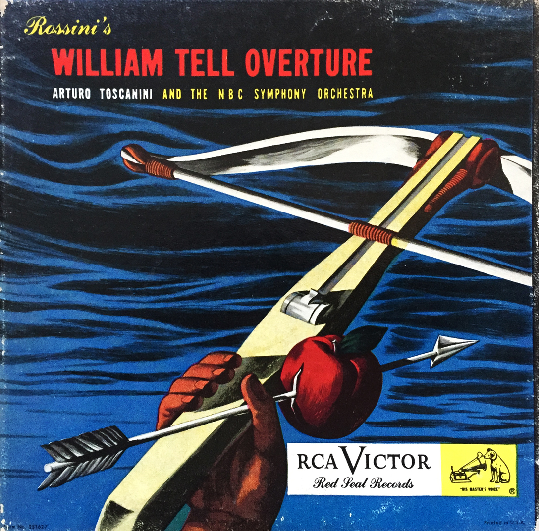 (Orangely) Clocking in at roughly 12 minutes, Arturo Toscanini’s interpretation of Gioachino Rossini’s infamous William Tell Overture can easily be downsized onto two, 45rpm records, as with this RCA Victor release from 1949. Now 67 years old, this double red vinyl box set is the perfect “quick fix” vehicle for long, dusty rides with the Lone Ranger, or eye-spying a quick romp with Alex and a few candy-sucking ladies he coerced from the local brick and mortar. Originally premiering in 1829 (!), William Tell has seen many, many iterations, and has dipped its toes in everything from children’s cartoons to ultra-violent, X-rated masterpieces. Surely one of those (mini) overtures prudent of a proper spin on a random Wednesday.