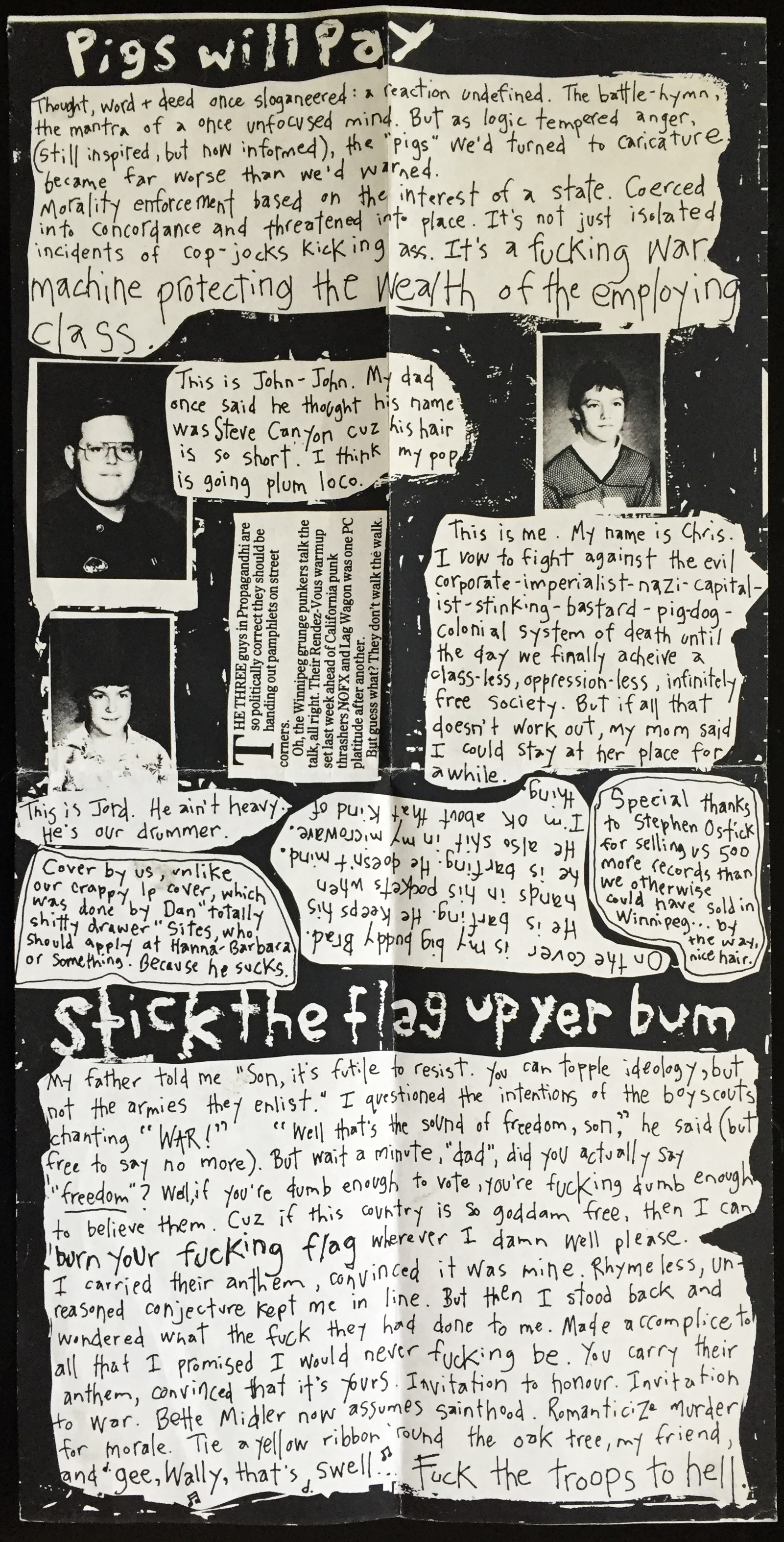 This comical insert to Propagandhi’s 7″ from Fat Wreck Chords once hung prominently on my bedroom wall some 18 years ago (yes, I’m that old). Now, it rests, tucked away inside the rarely played 7″ which is filed inside a shoe box on the office room floor. I can’t look at this and not think of innocent times nearly two decades ago. They don’t make ’em like they used to.