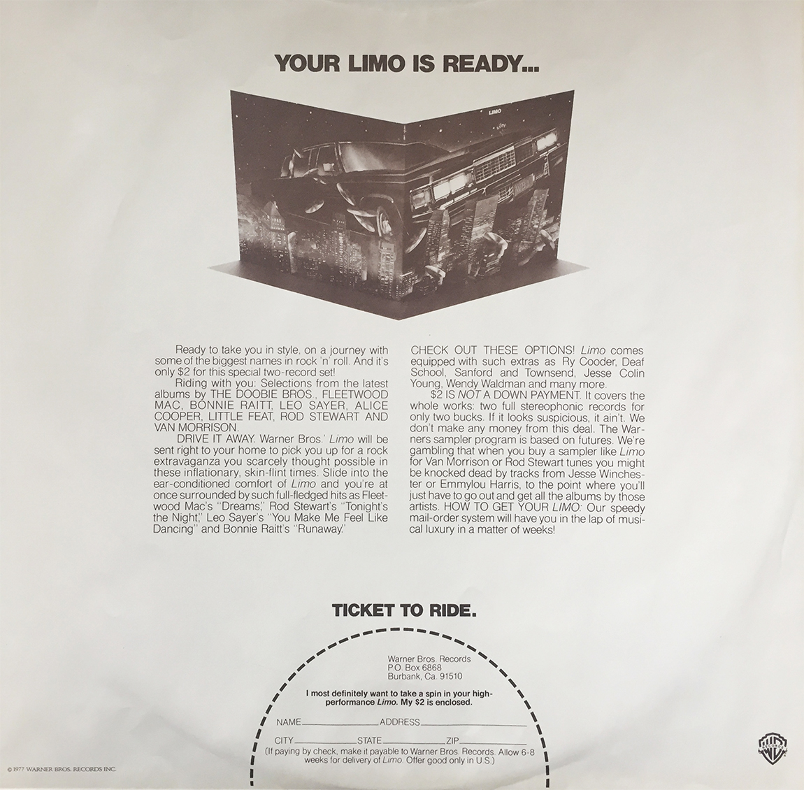 For just $2, back in 1977, you could have delivered, directly to your door, a special, 2 LP comp from some forward-thinkering heads of the Warners sample program. Van Morrison, Fleetwood Mac, Alice Cooper, and even The Doobie Brothers are all present and accounted for… and some Rod Stewart if that’s your thing… it’s certainly not mine. The sampler is simply called Limo, and currently fetches for… you guessed it, $2 over at Discogs. Head on over and check it out.