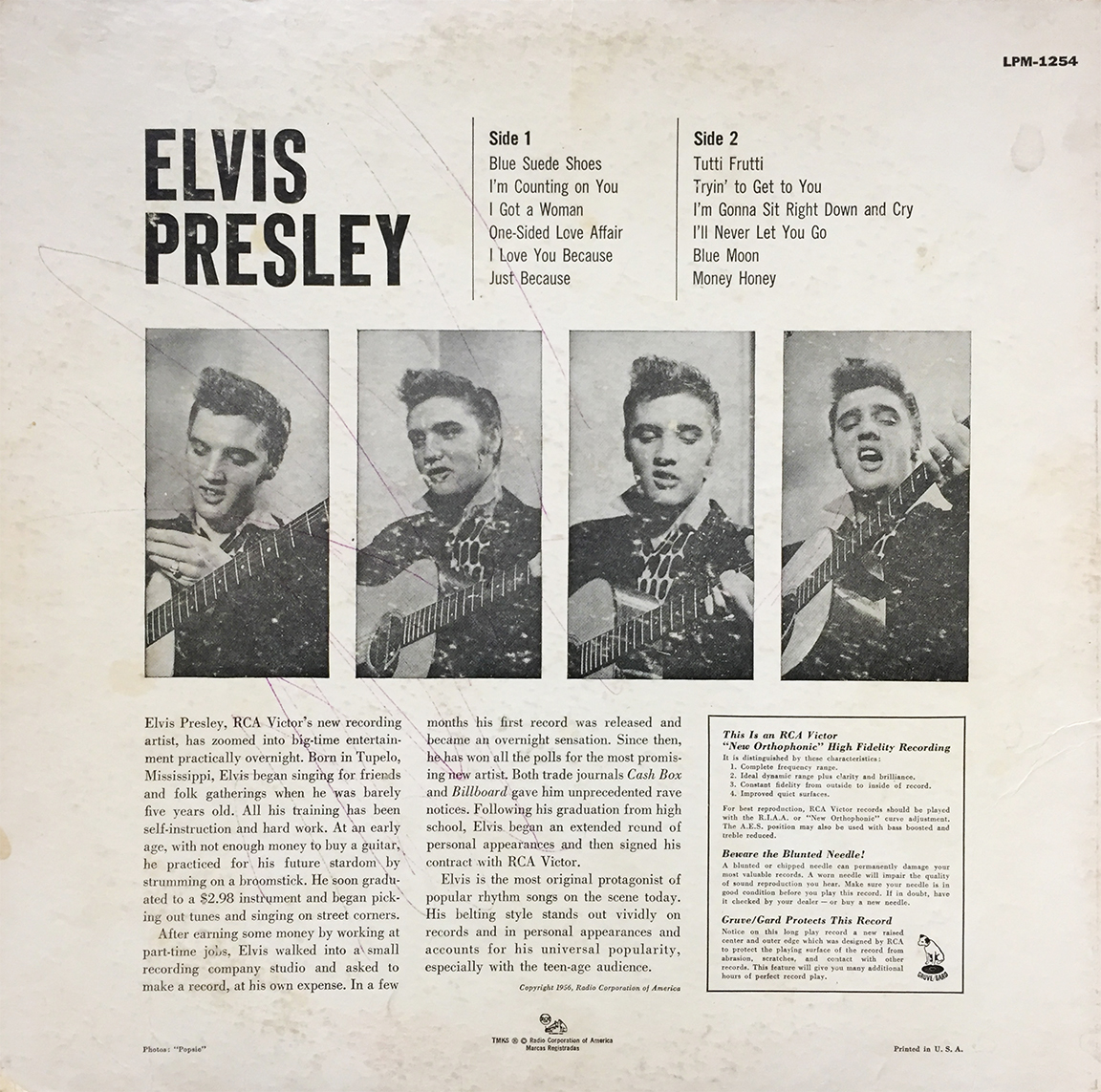 Everyone knows the iconic cover to Elvis Presley’s debut LP, but what few may recognize, outside of those who own, is its subtle back cover. Released on RCA in 1956, I present to you, for the first time on this site, Elvis Presley’s debut self titled back cover art. Disregard the purple pen scribbles.