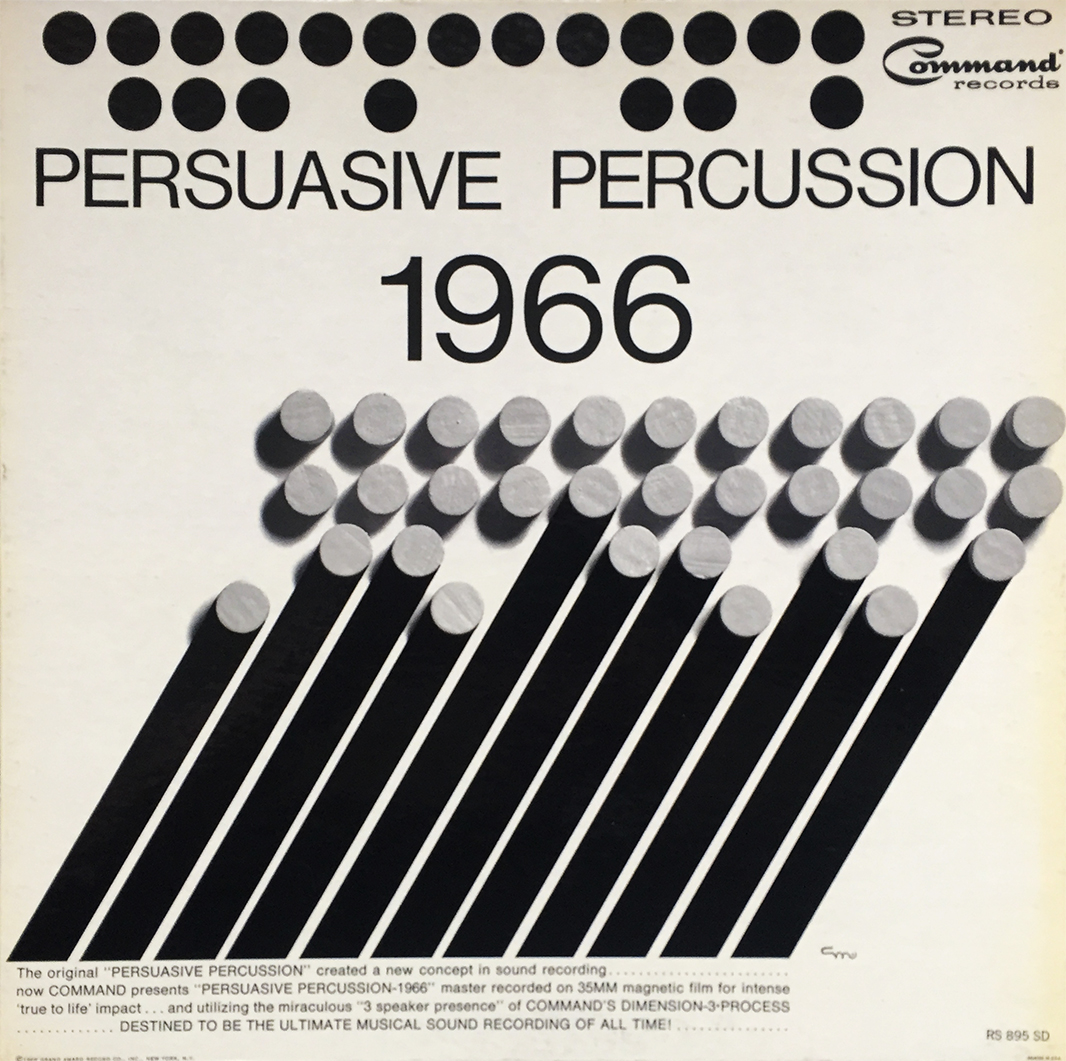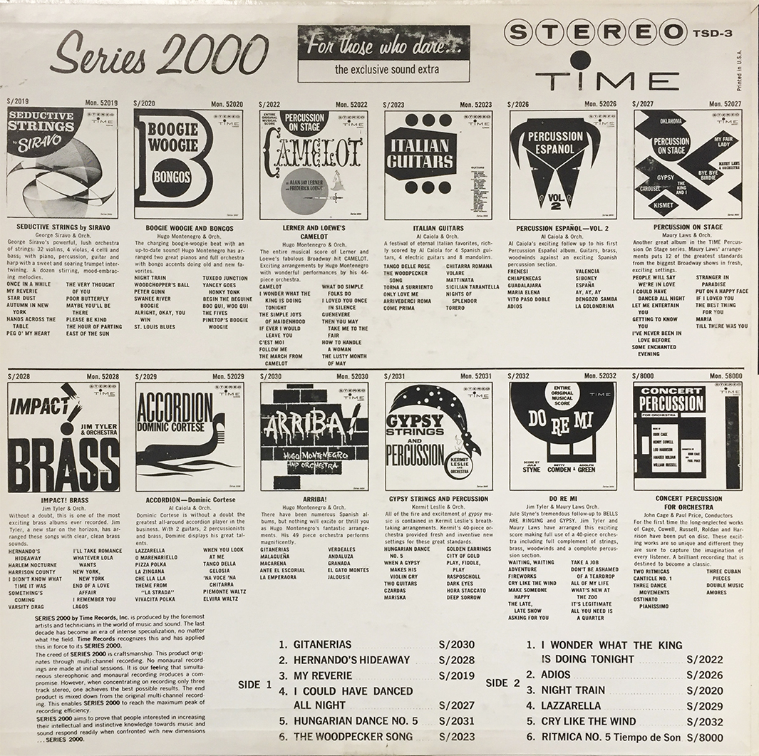 Since we were recently talking about it, have a look as the showcased albums from the Time Records Series 2000 collection, and count the number of percussion-based titles: Percussion on Stage, Percussion Espanol, Gypsy Strings and Percussion, and Concert Percussion for Orchestra. Four. I count four. Command Records knew it had a revolutionary and timeless release with Persuasive Percussion, which is further evidenced by its competitors, in this case Time Records and their Series 2000 team, trying at great lengths to cash in.
