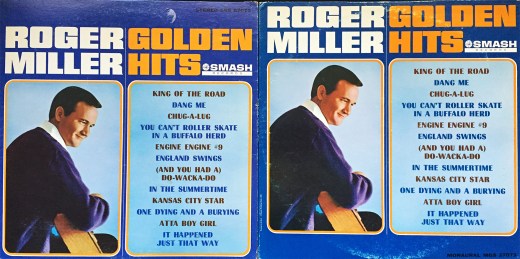 Presented here is, more or less, my latest obsession… Mr. Roger Miller. Mono on the right, stereo on the left, this classic “greatest hits” album can be had for about a quarter online (this doesn’t include shipping, mind you), but you can likely find it in the $1 bin at your local brick and mortar. All the singles are here, Dang Me, Atta Boy Girl, Do-Wacka-Do, In the Summertime, England Swings, Chug-A-Lug, and of course, King of the Road. I’d define Roger Miller as country in name only. He’s more of a goofball with an acoustic guitar any anything resembling Waylon, Johnny, or Willie, which makes him an easy and likable target for those not too fond of the genre as a whole. I guess, if pressed, what I dig most about Mr. Miller is his shining positivity. You can’t roller skate in a buffalo herd, but you can be happy if you’ve a mind to.
