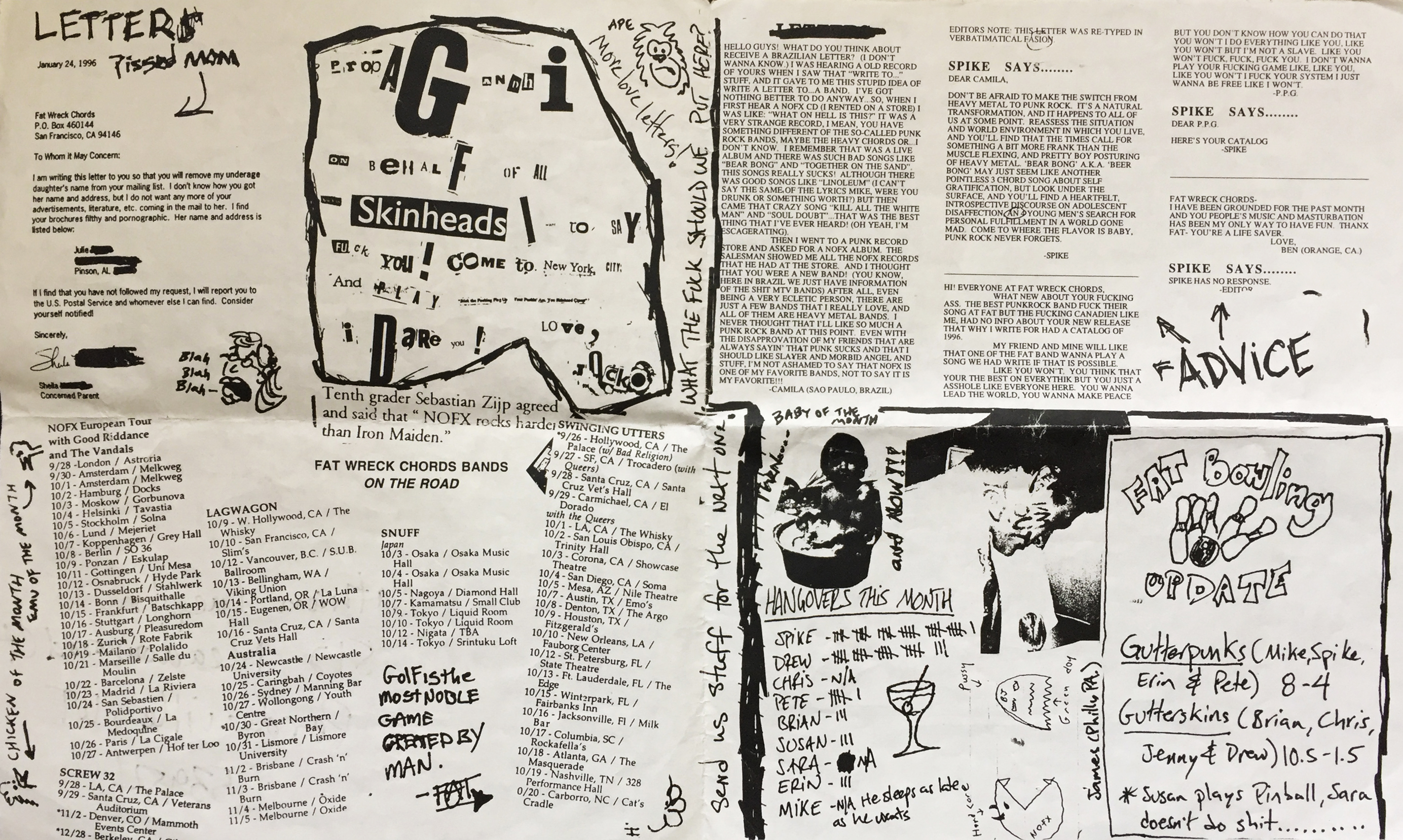 I vaguely (not at all) remember writing to Fat Wreck Chords back in high school, asking for some semblance of life outside the tiny, rural Wisconsin town I called home. What I received was this scrapbook photocopy of touring bands, lackluster anecdotes, and vulgar responses to questions I was unaware were asked. As a 16-year-old seeker, I couldn’t have been more pleased. Presented here is one side of the folded, post card-like continental representation of the Fat label I’d received. From San Francisco to rural Wisconsin… this was printed hope that life existed outside of Varsity pep rallies and isolated weekend shifts at the local Subway. To say I’ve been loyal to the label would be an understatement. This would have been sent some 22 years ago, and I just stumbled across it last night. To be completely honest, I’d completely forgotten this little piece of personal history even existed.