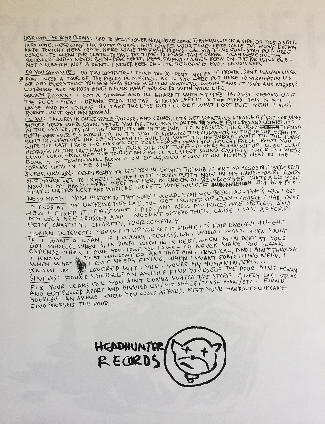 Procrastination has always been one of my strong suits. Next week, that will be neither here nor there. Presented here “today” is the handwritten insert, well, the copy of a handwritten insert to Drive Like Jehu’s 1994 math rock monument, Yank Crime. Like with most releases involving Swami John Reis (Rocket from the Crypt, Hot Snakes, Pitchfork, The Night Marchers, etc.), the lyrics to each song are painfully scrolled out in almost picture-perfect illegibility. While this gives a false sense of personal touch, it does weave together the incoherent and brilliant works of the mad genius that is Mr. Reis, and his merry band of mischief-seeking, and equally talented thugs. Yank Crime would be the 2nd of two albums that Jehu would release, and if you don’t already own it, make sure your used copy, if that’s your thing, contains this insert. If not, save the photo and print it out. You’re welcome.