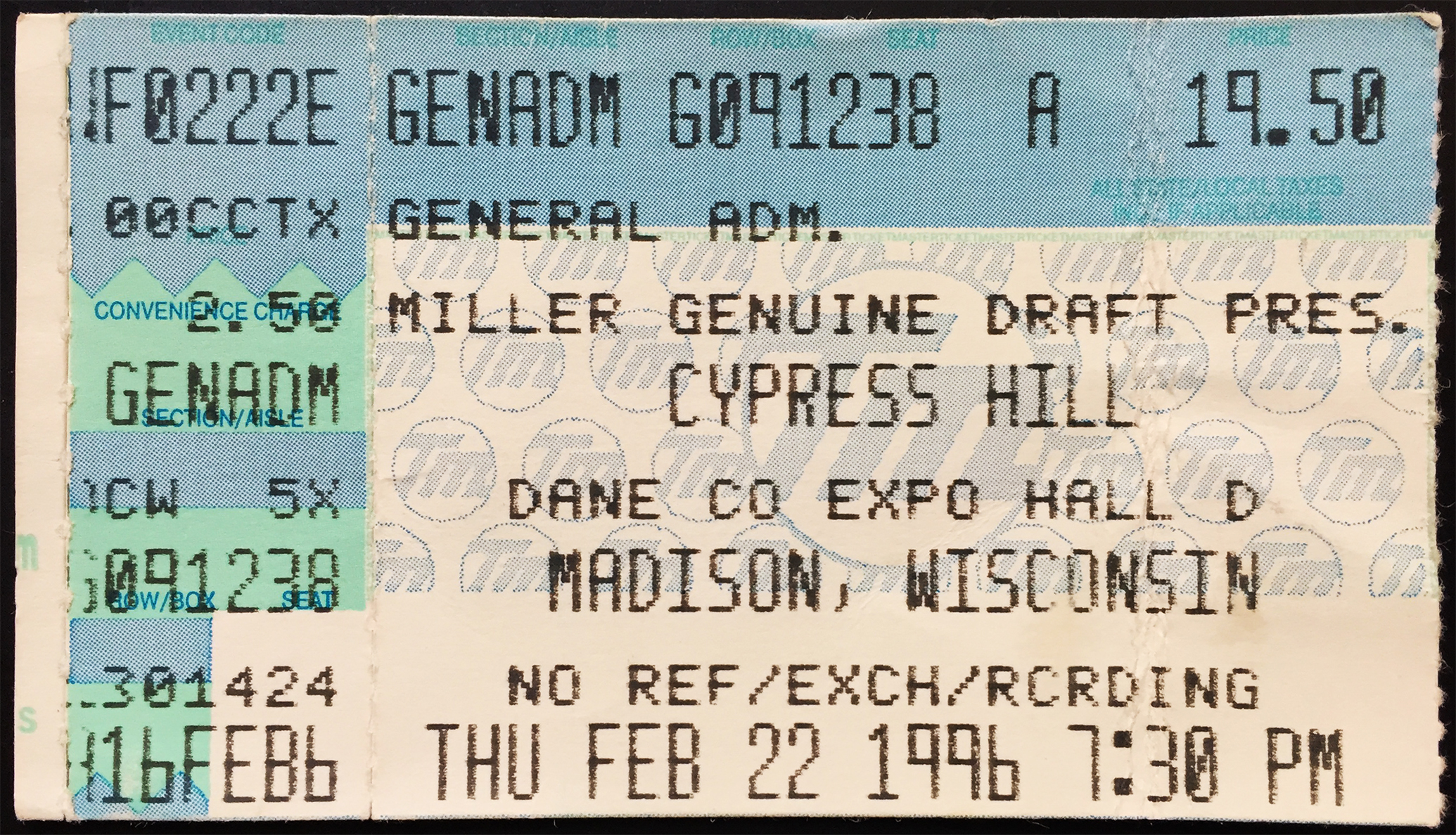 This 1996 Cypress Hill event was post III – Temples of Boom, their third studio release, and enveloped a moment in time that was arguably the group’s pinnacle state. At least, that’s what a bunch of us Juniors thought when we went to see them at the Dane County Expo Hall in Madison, Wisconsin. $19.50 for tickets… are you kidding me?! Oh, I forgot to mention that 311 and The Pharcyde were also present… UNDER $20, PEOPLE! $31.74 adjusted for inflation… still an absolute steal!