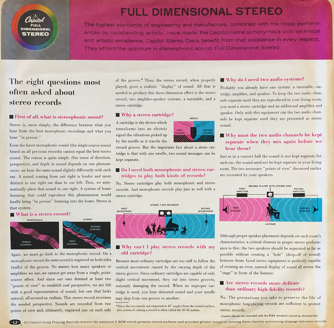 As frame worthy as it is informative, this in-depth breakdown of Full Dimensional Stereo by Capitol Records does a fantastic job, both with pictures and detailed description, to explain, in layman’s terms, answers to “the eight questions most often asked about stereo records.” The who’s and why’s to these questions are the outliers, but their answers are textbook, almost rudimentary cliff notes to this new and burgeoning technology. Pour yourself a cocktail and enjoy the soothing and lifelike sounds of full dimensional stereo.