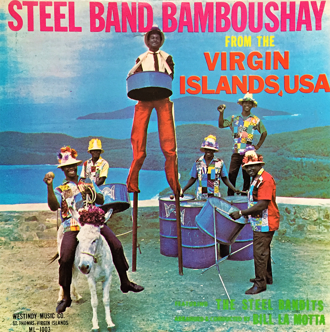 I loved the steel drum as a kid. I think I saw a demonstration on Sesame Street or something, but the tin-y twang was a sound I’d never heard before, and it fascinated me. That was 30+ years ago, so imagine my excitement upon finding this 1965 Virgin Islands release by The Steel Bandits titled, Steel Band Bamboushay. I can say I’ve had the pleasure of seeing the steel drum in action twice, and I’m grateful for the opportunity to welcome 12 steel drum tracks into the library.
