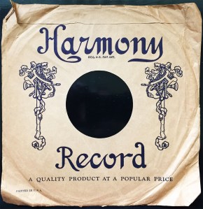 A (very) brief remembrance of Harmony Records, a has-been sister company of Columbia Records starting in 1925. Manufactured as a lower budget option for the 78rpm crowd (a quality product at a popular price, as they liked to say… apparently), Harmony was initially active nearly a hundred years ago in the 1920s and 1930s. Harmony was home to acts I’ve never heard of, and could only attempt to make up (The Dixie Stompers, University Six, Banjo Barons, The Savannah Six, Three Monkey Chasers), and this vintage sleeve, complete with groovy logo, has withstood the test of time, and has recently been welcomed to the (ever-growing) collection of one-off sleeves in the library… as if space wasn’t already an issue…