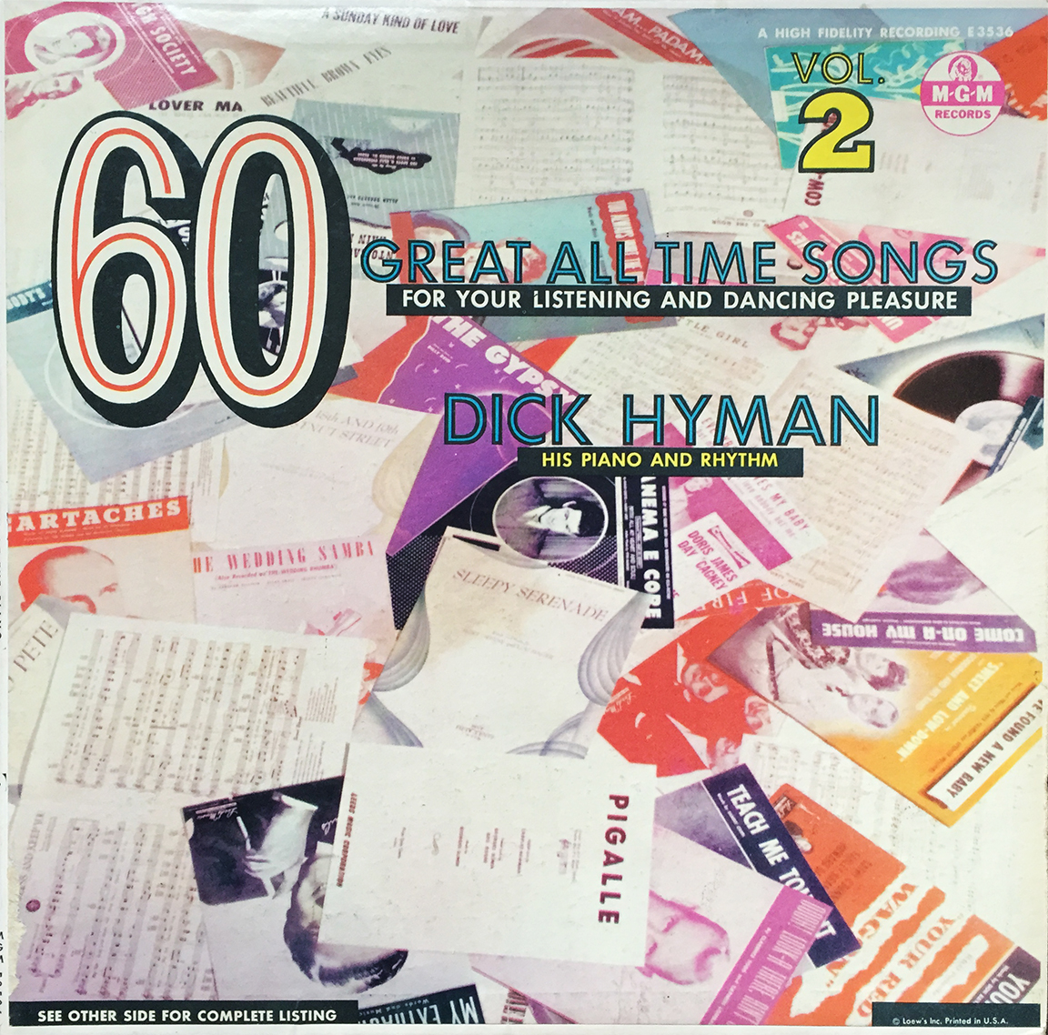 60 tracks on one LP… are you kidding me? “Hells no” says Dick Hyman with his 1957 release, 60 Great All Time Songs Vol. 2 For Your Listening And Dancing Pleasure. As far as I can tell, there are four volumes total in the Great All Time Songs library, none of which I currently own, with the exception for the Vol. 2 you’re currently looking at. So, you know, there’s that.