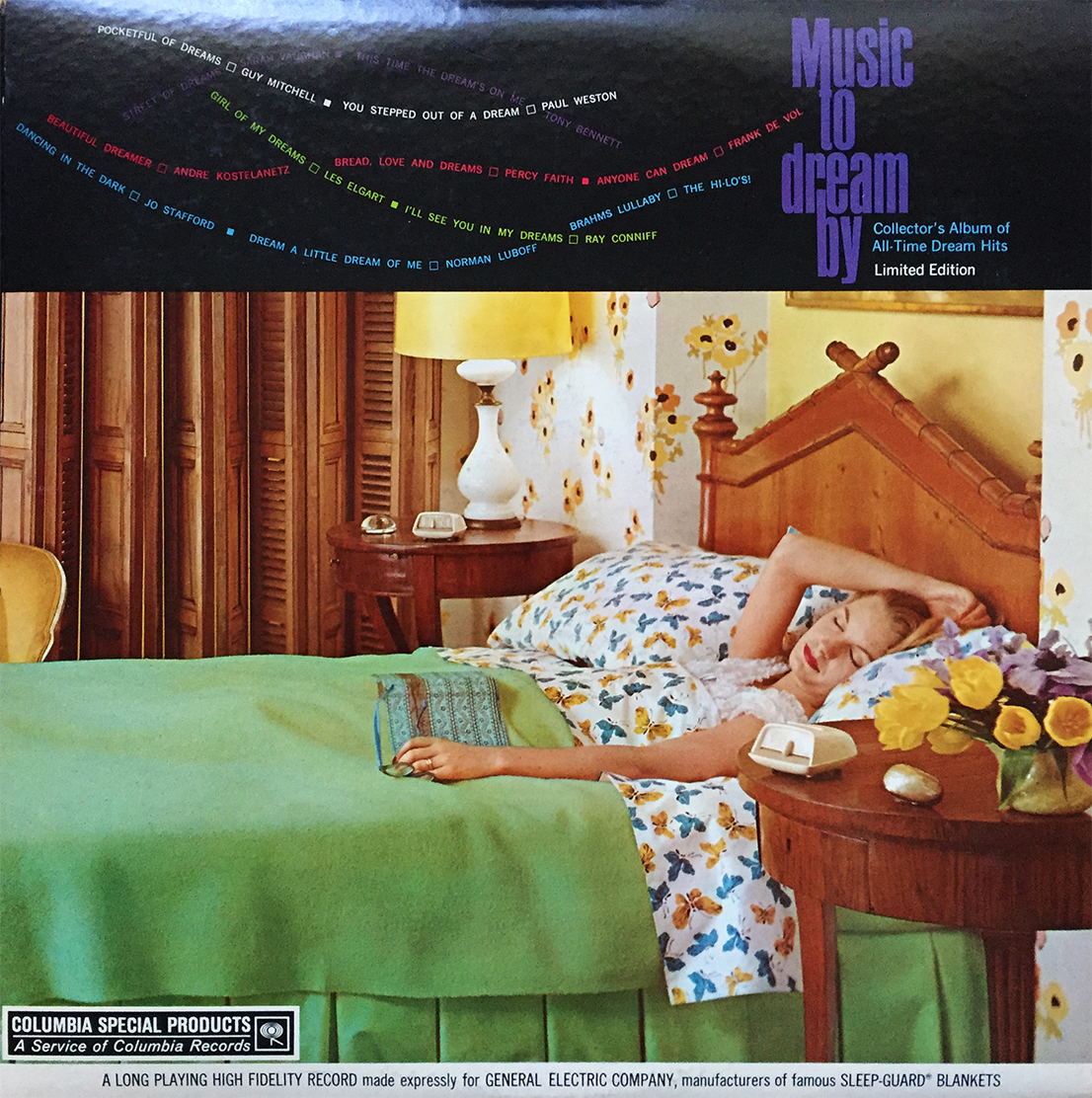 What’s your dream soundtrack? Do you have a specific playlist for naps? Have you ever given it any thought? If you haven’t, by all means necessary, do not consider CBS Special Products’ 1966 sleeper, Music to Dream By. Filled with a slew of Percy Faith, Ray Conniff, and Guy Mitchell’s of the time, Music to Dream By was a “Collector’s Album of All-Time Dream Hits” compiled specifically for the GE company and their “famous” Sleep-Guard Blankets. Blankets… yup, you read that correctly. This here is a bona fide blanket record, and it will put you to sleep faster than a mashed potato sandwich. Proceed with extreme caution.