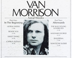 A familiar sight to many of you who own, what I’ll argue to be, one of the top 10 recorded pop albums of all time. Van Morrison’s 1968 Astral Weeks is a timeless, immortal collection of eight tracks broken into two parts: In the Beginning (side A) and Afterwards (Side B). Though Astral Weeks is technically Mr. Morrison’s second studio record, it is, without question, his first, and best album.