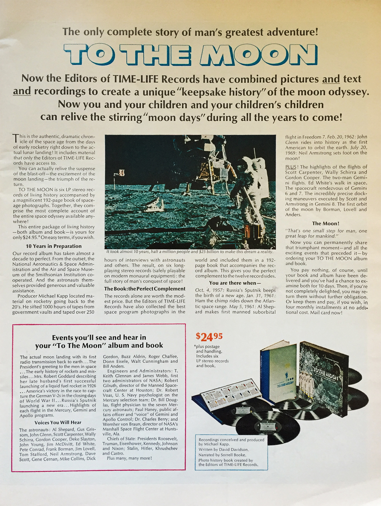 Was flipping though a November, 1969 issue of Life magazine last night, you know, the one with “The Rough-cut King of Country Music” on the cover, aka Johnny Cash, and I came across this amazing full page ad for Time Life Records’ 6x LP box set, To the Moon. I’d acquired this piece of Americana at my brick and mortar about a year ago (the box set, not the magazine… I have my wonderful folks to thank for that one), and I’ve been a bit obsessed with it after the reissue announcement of the Voyager Golden Record box set (Kickstarter), so let’s just say I was a bit beside myself and had to do a double take upon its random discovery in the Life magazine that had been sitting on our living room table for the better part of three years. Man can step foot on the Moon, but I can’t discover a 47 year old record advertisement sitting beneath my nose. For shame.