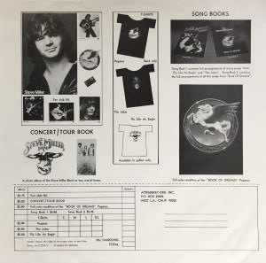 Oh, Steve Miller. Tucked inside my 1977 copy of Book of Dreams was this pristine insert order form. From posters, to a concert / tour book, to a variety of shirts, and finally to a grab-bag fan club kit, Jokers and Jet Airliners alike could spend their hard-earned, late 70s cash on solid Steve Miller schwag, and for seemingly modest prices. One can never have too much Steve Miller schwag as far as I’m concerned, and the fine people at Capitol Records felt the same way.