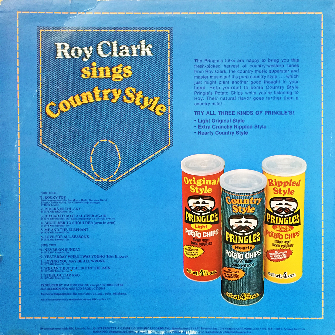 Leave it to good ol’ boy Roy Clark to team up with Pringle’s (circa: 1978) to righteously promote “Hearty Country Style” flavored tube-chips on the back of his 11-track classic, Roy Clark Sings Country Style. Remember back in June when I inquired about what other prominent country legend was associated with a delicious, rural delicacy? Well, Mr. Clark, I stand corrected.