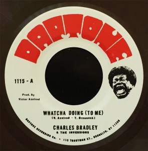 Daptone Records released this two-track 7″ on random colored vinyl last month. It features Mr. Charles Bradley & The Inversions performing Whatcha Doing (To Me), b/w just The Inversions performing Strike Three. Some yahoo is selling this 7″ on Discogs for $74.99, and it was just released some 12 days ago. Some people… am I right?! Regardless, RIP Charles Bradley.