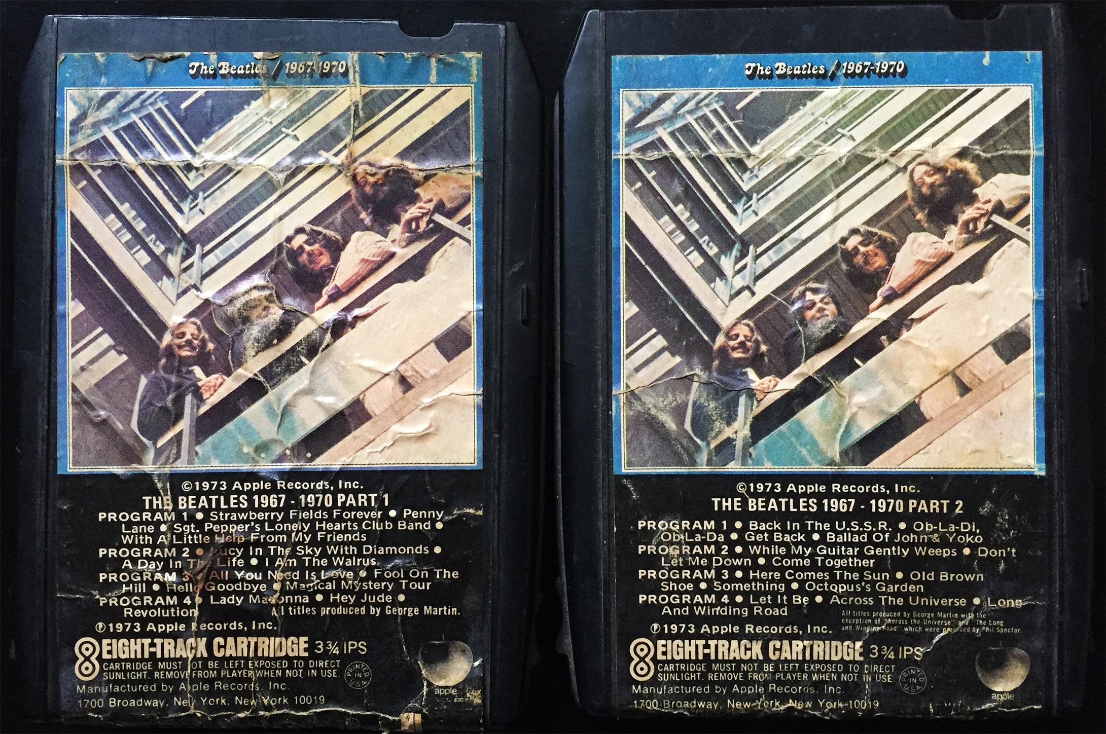 Hunting for elusive and quintessential records while at the same time tracking down (see what I did there) casual listening and essential 8-tracks is a bit of a full time job. Lucky for me, my folks support and encourage this practice, and gobble up each and every much needed 8-track they can find. Perfect example, this double 8-track comp by the Beatles titled, 1967 – 1970 from 1973. They were presented to us just the other day, and by the sounds of it, were nabbed for a cool $0.50. Thanks, M & D for the mounding stash of GR-8-tracks, for the constant support, and for turning me on to The Beatles!