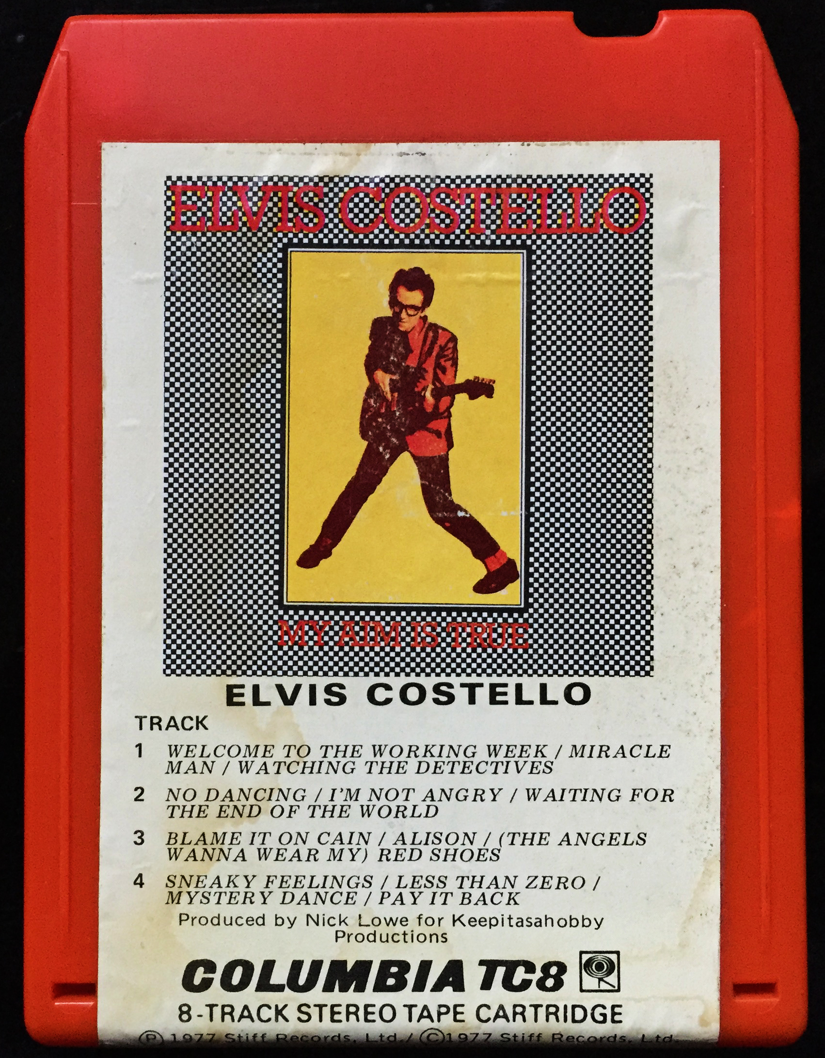 So, and I’m sure this comes as no surprise, but when I get into something, say an artist, say, Elvis Costello, I get head over heels into them! This recent acquisition, on 8-track cassette is of Elvis Costello’s debut, 1977 album, My Aim is True. Lucky for us, the 8-track stereo hi-fi is in full, functioning order, so casual reading sessions on the living room couch will now sound even better, thanks to Declan Patrick MacManus and his late 70s classic.