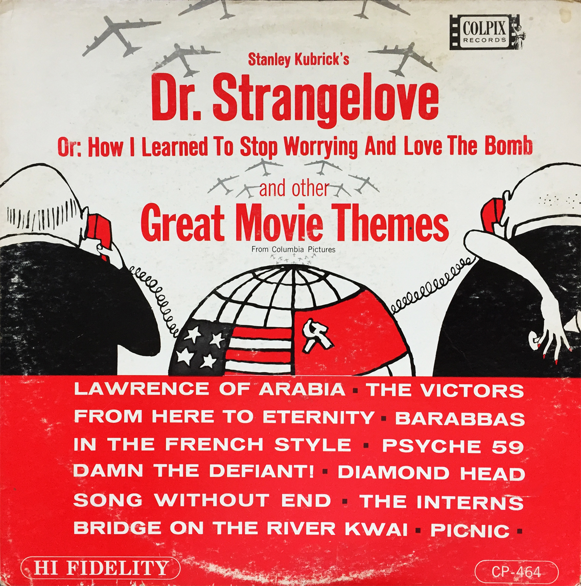 In 1964, the greatest film the world has ever known exploded onto the pale faces of Western civilization. Today, I obtained the closest thing to an officially released soundtrack from this, my all-time favorite film, Dr. Strangelove. Dropping the same year as the film, this various artist comp features a total of 13 tracks, with only one of them being featured in the aforementioned film. But that’s certainly ok, and completely without contention, for you see, this album, with all its 1964-infused Dr. Strangelove poster art, is for visual stimulation, instead of those more pleasing to the ear. I’m elated to welcome the most recent addition to my billowing record collection, Dr. Strangelove and Other Great Movie Themes.