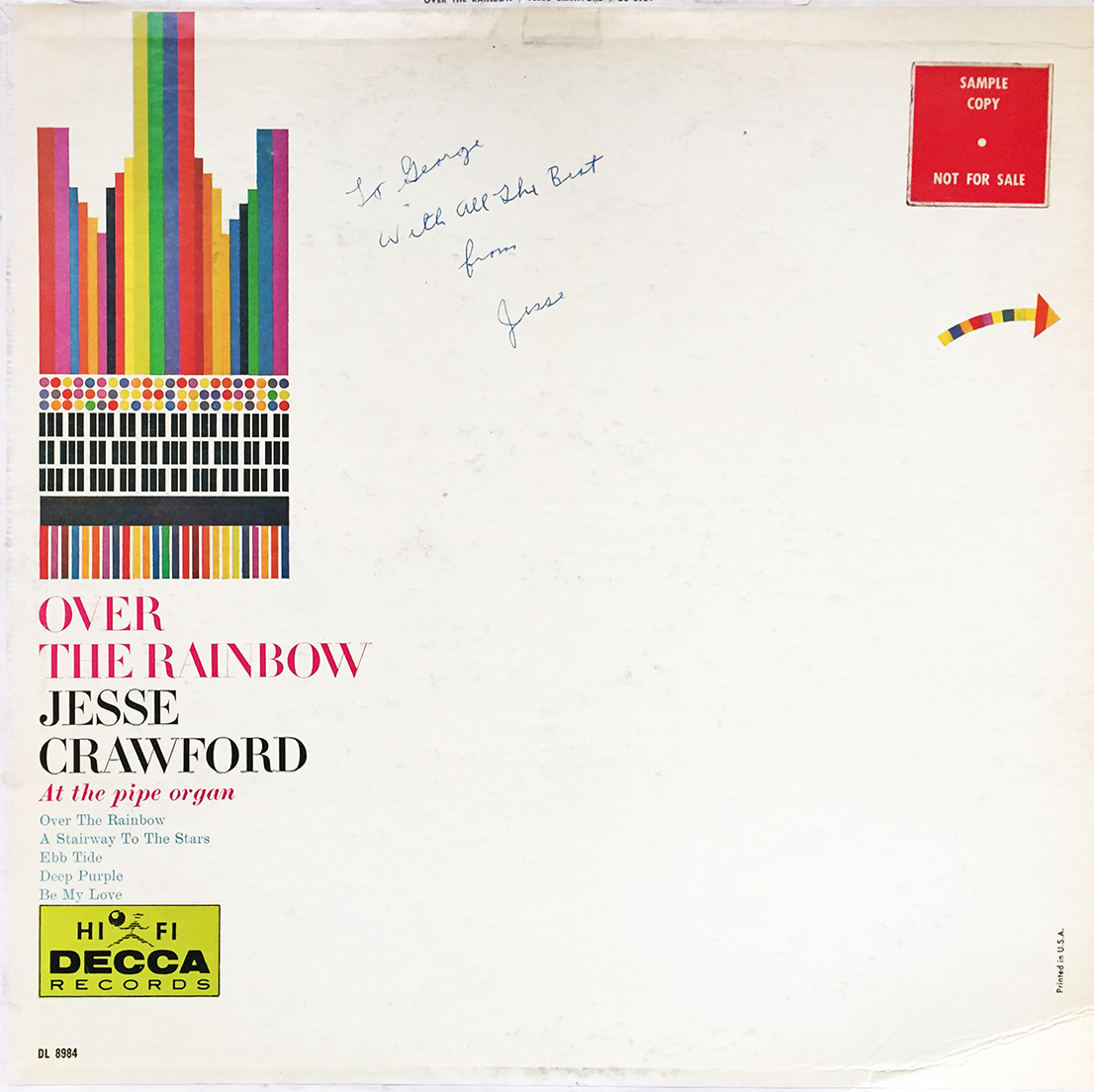 Little is known (by me) about theater organist Jesse Crawford. Big in the 1920s and 1930s, he received the “Decca treatment” on this 195? mono release of Over the Rainbow. Though I generally steer clear of organ-based wobblers, I couldn’t pass up the amazing cover art, depicting a sensationally colorful, and spectrum-spanning pipe organ. This copy is also signed by Mr. Crawford, so that helped matters.
