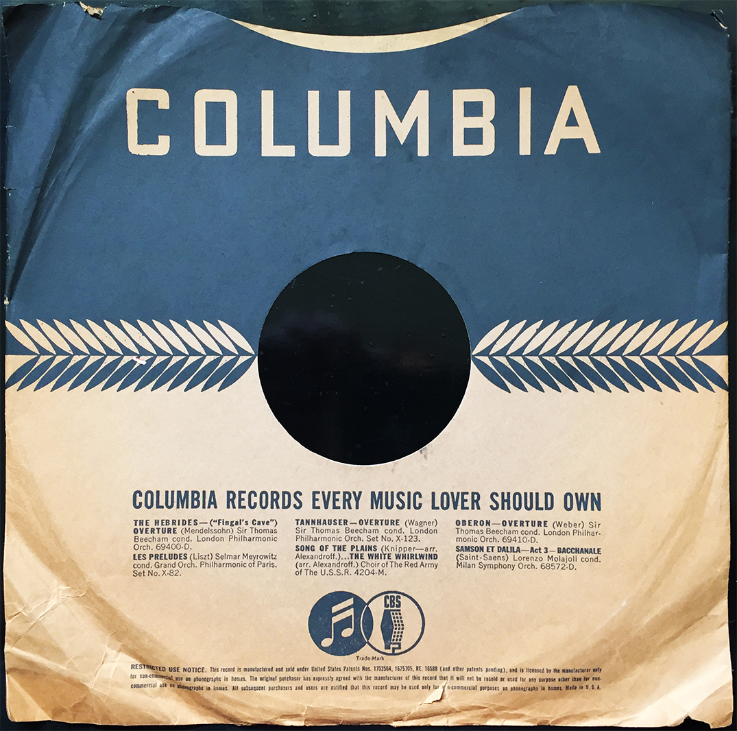 Do you love music? Do you OWN music? Why not take Columbia Records out for a spin and see how the night goes? Dinner is optional, if you know what I mean. Columbia Broadcasting System wants you (and your pocketbook) to indulge in some fantastic, and noteworthy releases via their vibrant, 78rpm catalogue. Featured here, on this 1930? protective sleeve are descriptions of releases by Sir Thomas Beecham, Lorenzo Molajoli, Choir of The Red Army of The U.S.S.R., and Selmar Meyrowitz, but most notably, fancy yourself a gander at this amazing (yet strikingly simple) layout, and the CBS “Trade-Mark” logo. Columbia?! Yes, Gloria… Columbia.