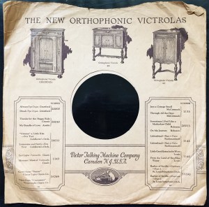 Victor strikes again with its overly simplified clip art cover for a vintage 78 sleeve. Every instrument of music, and famous Victor artist awaiting your command to play… ok, like, I’m in control, yeah? I “command” my string section to perform strictly for me, whenever, and for however long I’m willing to operate the crank. Actually, yeah… that sounds nice. Kind of consumerist royalty. Shut up, Victor, and take my money!
