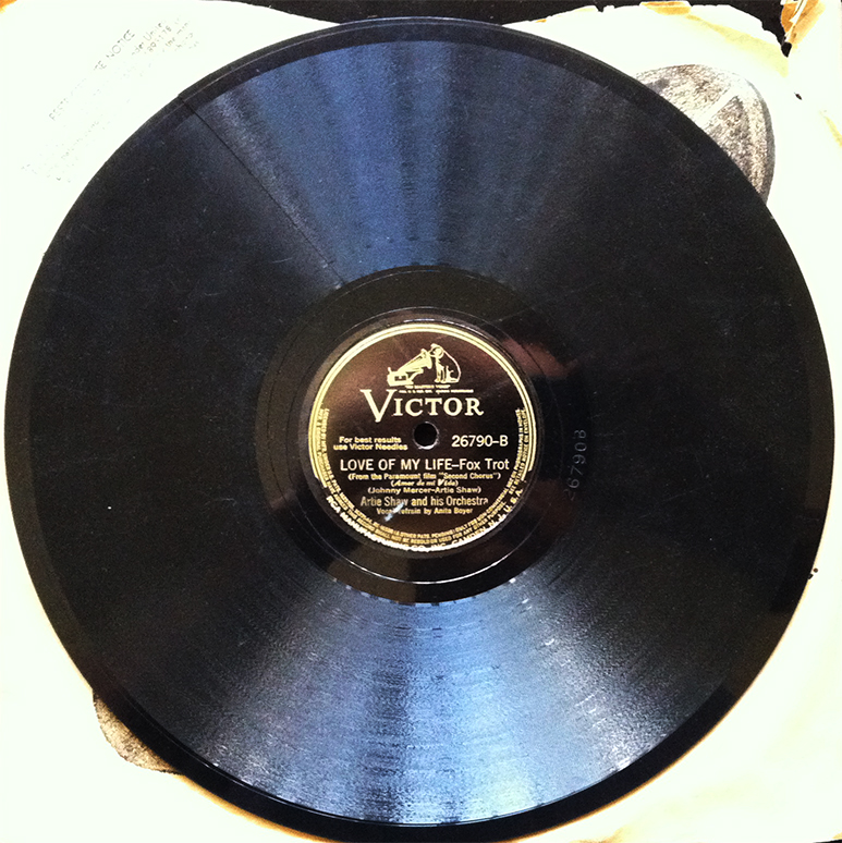 Cracked grooves break my heart… especially Oscar nominated cuts from the 1940s. The 1940 film, Second Chorus, featured both this shellac track, Love of My Life, as well as a clarinet-yielding Artie Shaw, masterfully (I assume) portraying himself up on the big, flickering dream-screen. Never saw it, but with a score and on-screen performance provided by Mr. Shaw himself, this little entertainment blip just spun onto my radar.