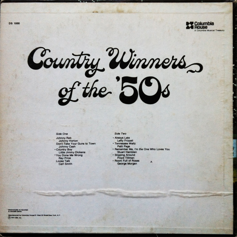 1972’s Country Winners of the ‘50s is probably my earliest mail-order album offered from the minor-music-loving-money-snatchers, Columbia House. I have a rather unsettling confession to make. Back in Junior High, I was a member of Columbia House (as were the majority of my friends). Sure, I got suckered into 10 CDs for a penny, and nearly wept at the terribly overpriced, mediocre albums I was forced to purchase in order to round out my membership obligation. I believe Aerosmith got heavy play in those days… it was a dark time for sure.