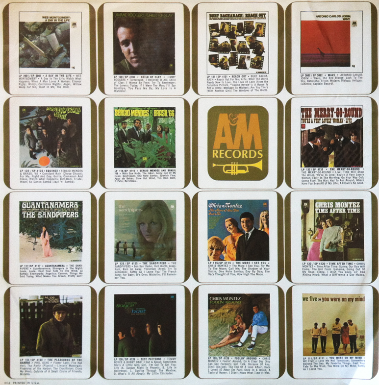 Let’s take a little look-see through this colorful back catalog to the now defunct A&M Records, shall we? As noted before (I think…), A&M Records was started by Mr. Tijuana Brass himself, Herb Alpert. Groovy, no? If you look closely, you’ll notice a few CTI Records scattered about (Wes Montomery’s A Day in the Life and Antonio Carlos Jobim’s Wave), and let’s not forget that CTI Records (Creed Taylor Incorporated) started as a subsidiary of A&M before spreading their independent wings and going solo in 1970, which places this insert somewhere between 1967 and 1970… for what that’s worth. Sidebar, I’m rapidly running out of inserts, and this deeply saddens me. The hunt shall undoubtedly continue.