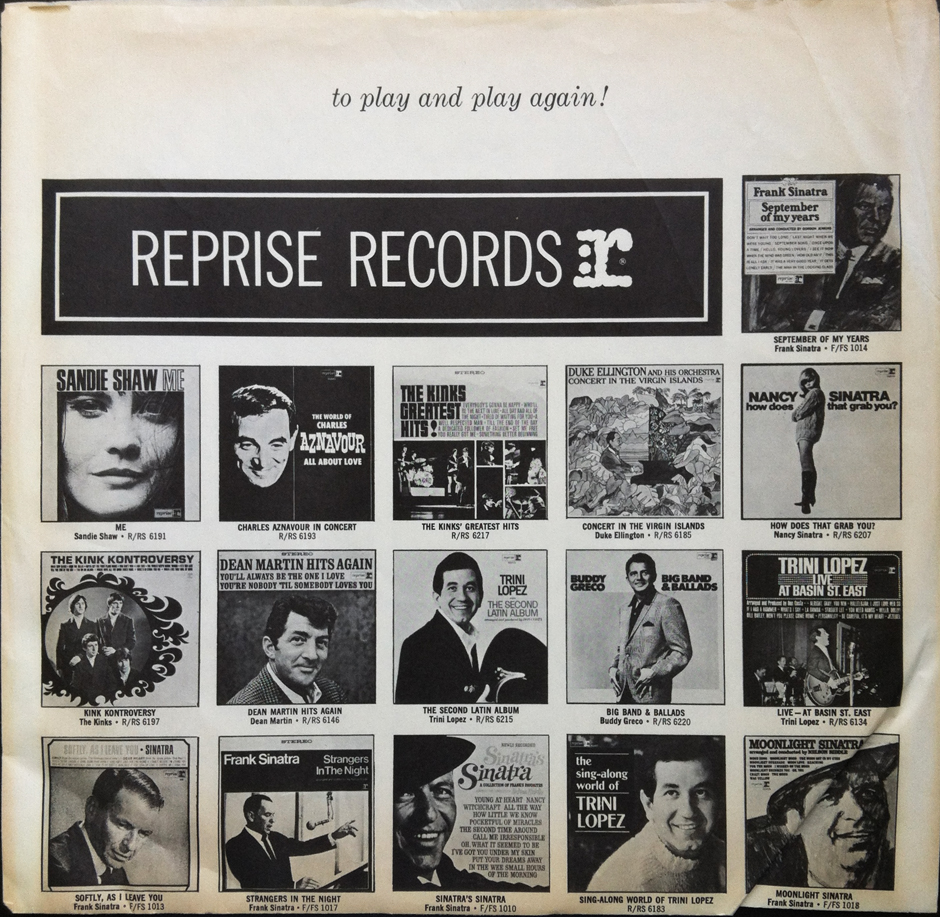 Fine, I’ll tell you. They were all monumentally talented artists on the Reprise Records label. As a longtime collector of the Kinks, I’m a bit surprised to find Duke Ellington and Dean Martin to be their egg-borrowing neighbors. Apparently Reprise was started by Frank Sinatra in 1960, and then sold to Warner Bros. Records in 1963… and a year later the label would land the rights to Pye Records (UK label of the Kinks), and the well-rounded and eclectic Reprise Records family was born.