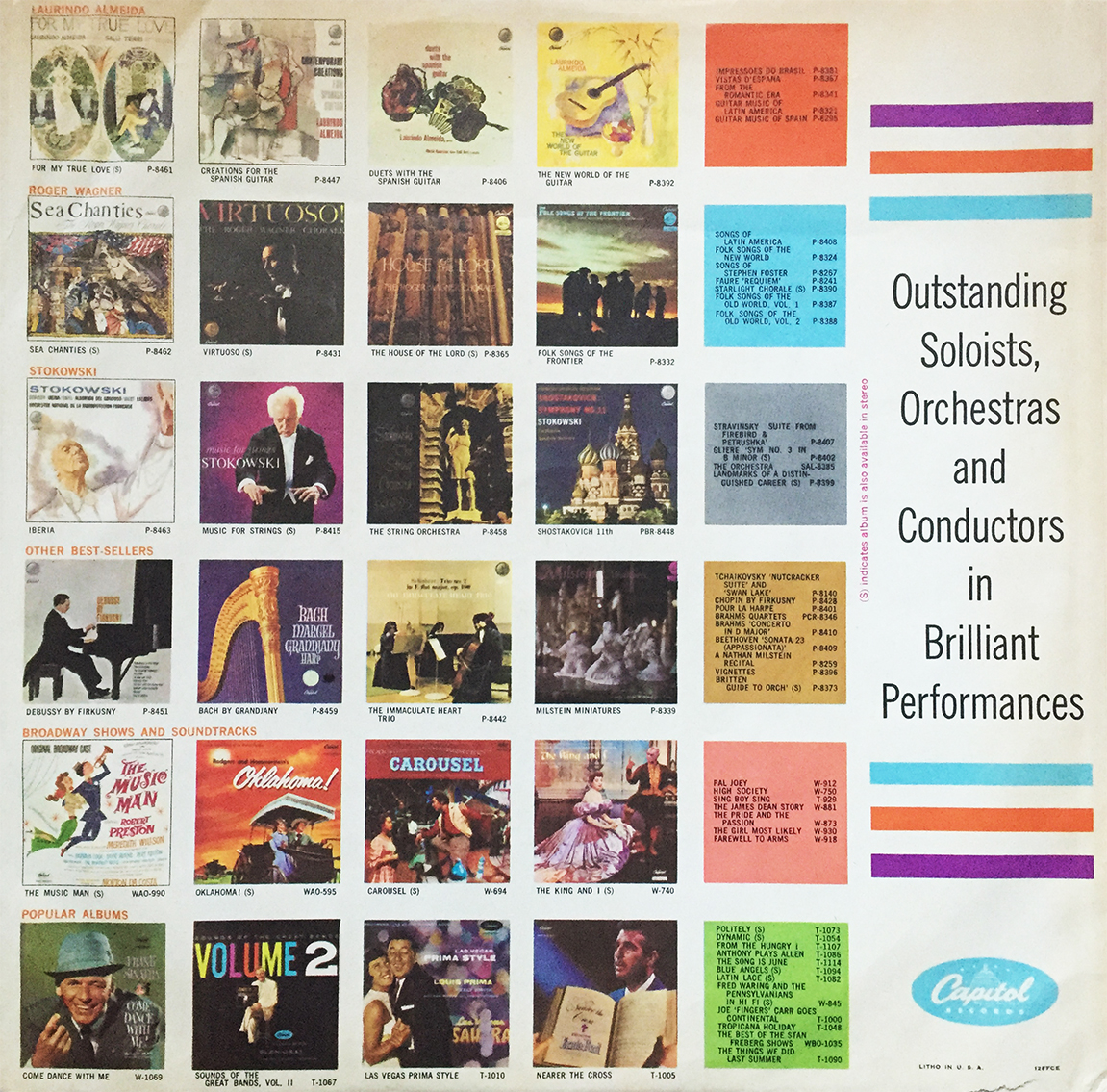 A quick (very, very quick) fact check places this Capitol Records insert in, or around the year 1959. Meredith Wilson’s Original Broadway Cast of The Music Man was released in ’57, Louis Prima’s Las Vegas Prima Style was ’58, and Sinatra’s 1959 Come Dance With Me! all help make this claim. Regardless, these vibrant colors coupled with this elegant and straight-forward layout make for compelling and eye-catching contemporary art. My local record store has STACKS of these random inserts, and I’m 15 minutes shy of heading down there and asking how much they want for the lot. I’m sure my SO would be thrilled to beat the band about me acquiring even more record paraphernalia. Let the convincing commence…