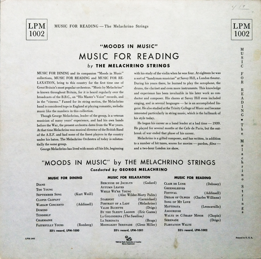 Music for ReadingGrab your favorite E. A. Poe, H. S. Thompson, J. Shepherd or T. S. Eliot, and set your hi-fi to a warm and welcoming volume, because The Melachrino Strings wonderfully, and eagerly present, Music for Reading.