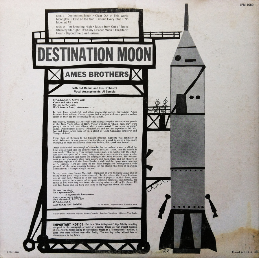 Destination MoonLate 50s Jazz Pop with a theme that’s… I’m sorry; I have to… out of this world. I don’t own anything else by the Ames Brothers, but my intergalactic curiosity for more, good-time, secretly wholesome, space-themed 50s music will undoubtedly point me to the direction of the orbiting cluster of space debris called, the Ames Brothers.