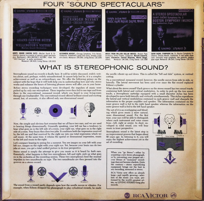 Yesterday we inaugurated the intricate fascinations of Stereophonic Sound. Today, we pick up where we left off and continue with RCA Victor’s detailed explanation of the technical differences between recording a monaural record with that of the stereophonic record. So, without further ado, I present part 2 (out of 3) of RCA Victor’s What is Stereophonic Sound?